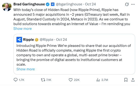 Ripple completed its acquisition of Hidden Road on 24 October 2025, rebranding the business as Ripple Prime—a global multi-asset prime broker aimed at institutional clients.